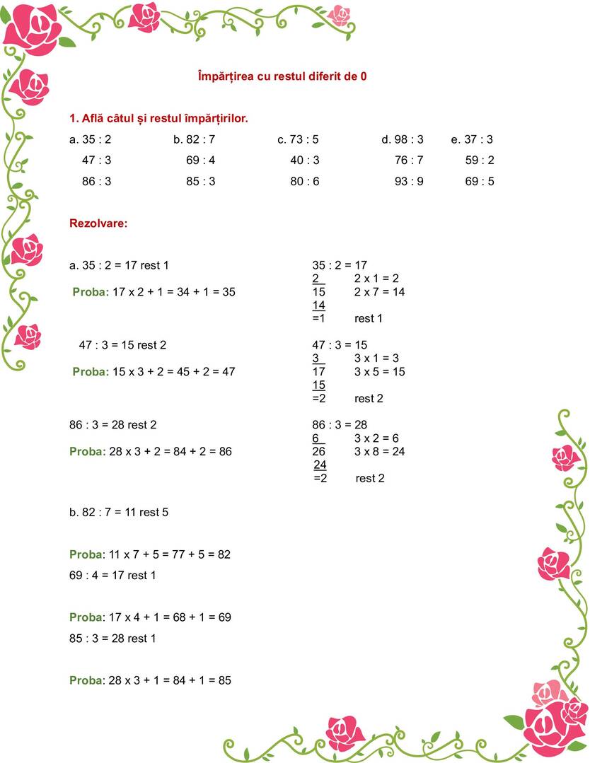 Împărțirea cu restul diferit de zero. Exerciții și probleme rezolvate clasa a IV-a
