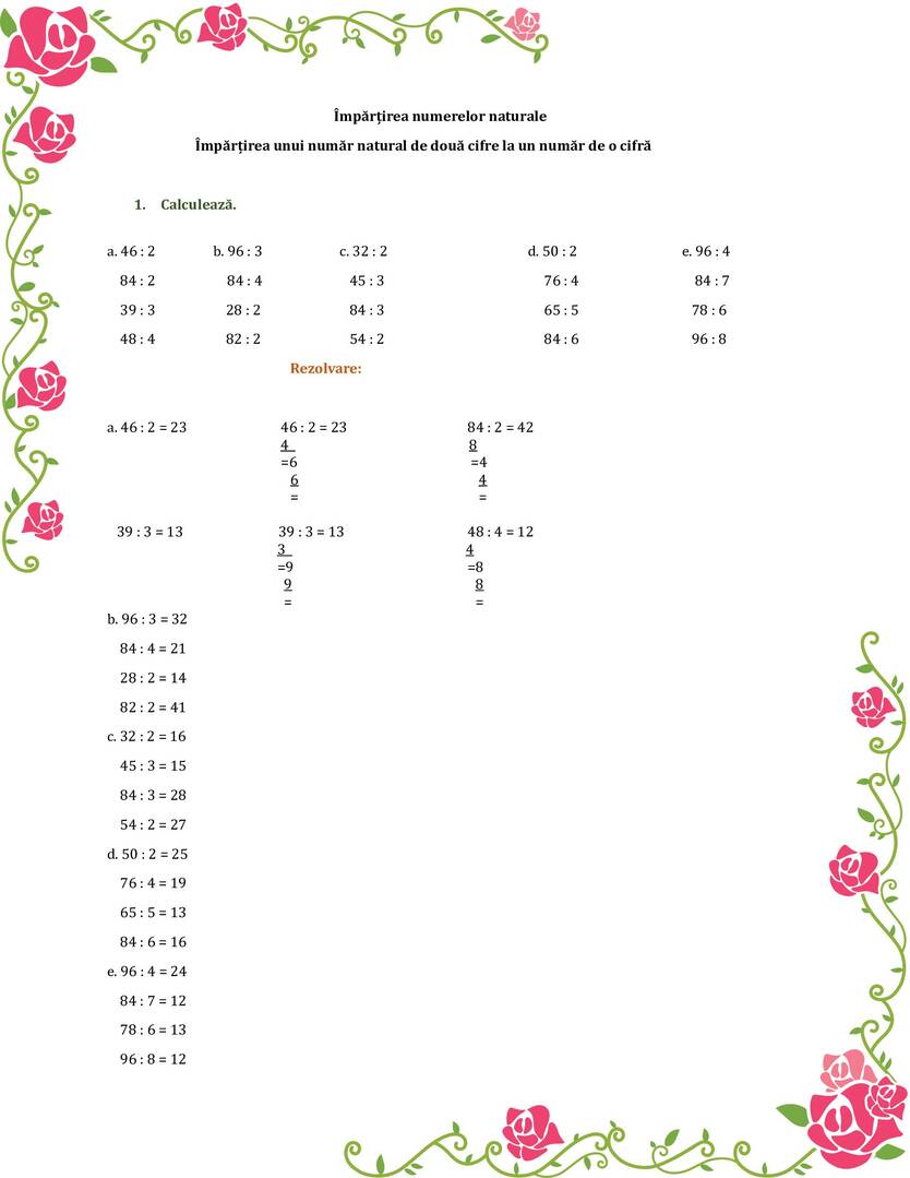 Împărțirea unui număr de două cifre la un număr de o cifră. Probleme rezolvate clasa a IV-a