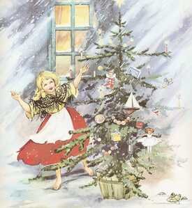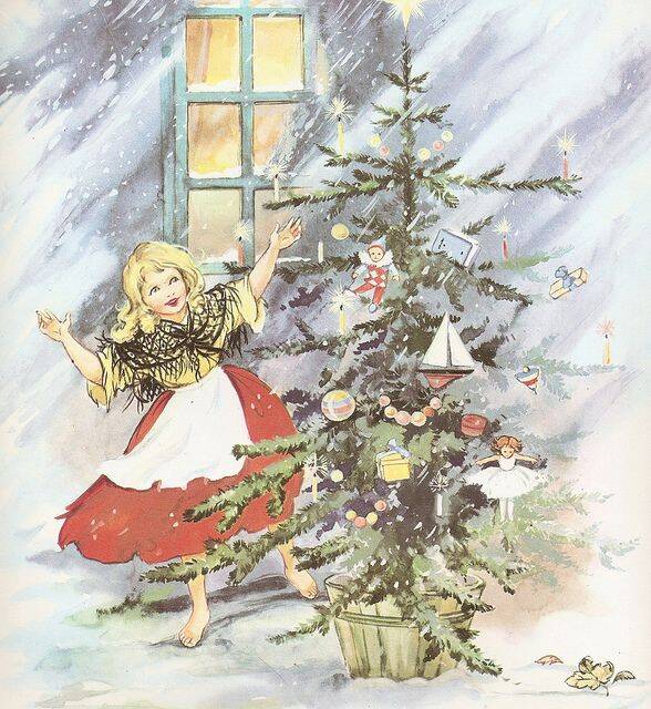 Mai aprinse un chibrit și se pomeni lângă un pom de Crăciun cu mult mai frumos de cum văzuse ea anul trecut prin geamul de la ușa unui negustor bogat. Pe ramurile lui verzi străluceau mii de lumânări colorate; de toate părțile atârnau cofeturi, jucării poleite, o grămadă de minuni. Fata întinse mâna să apuce pe cea mai puțin frumoasă...