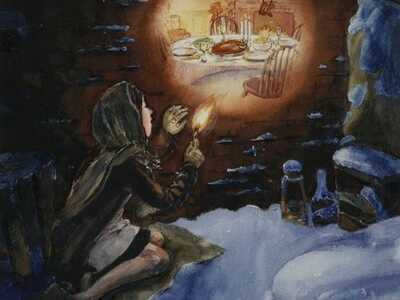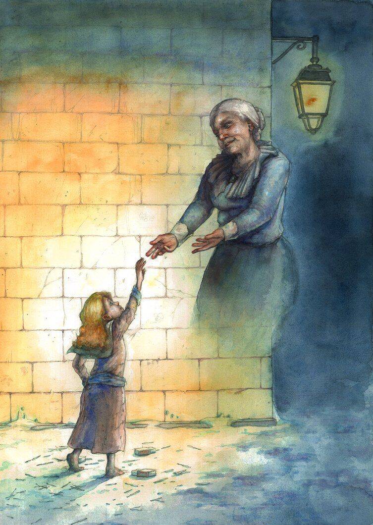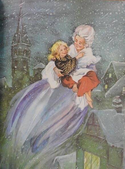 Bunica nu mai era cocoșată și slabă ca atunci când murise, ci se schmbase cu totul la față. Luă pe fată în brațe și, zburând în văzduh, o duse sus, sus tare, într-un loc unde nu e nici frig, nici foame, nici mâhnire.... Se afla în fața tronului lui Dumnezeu...