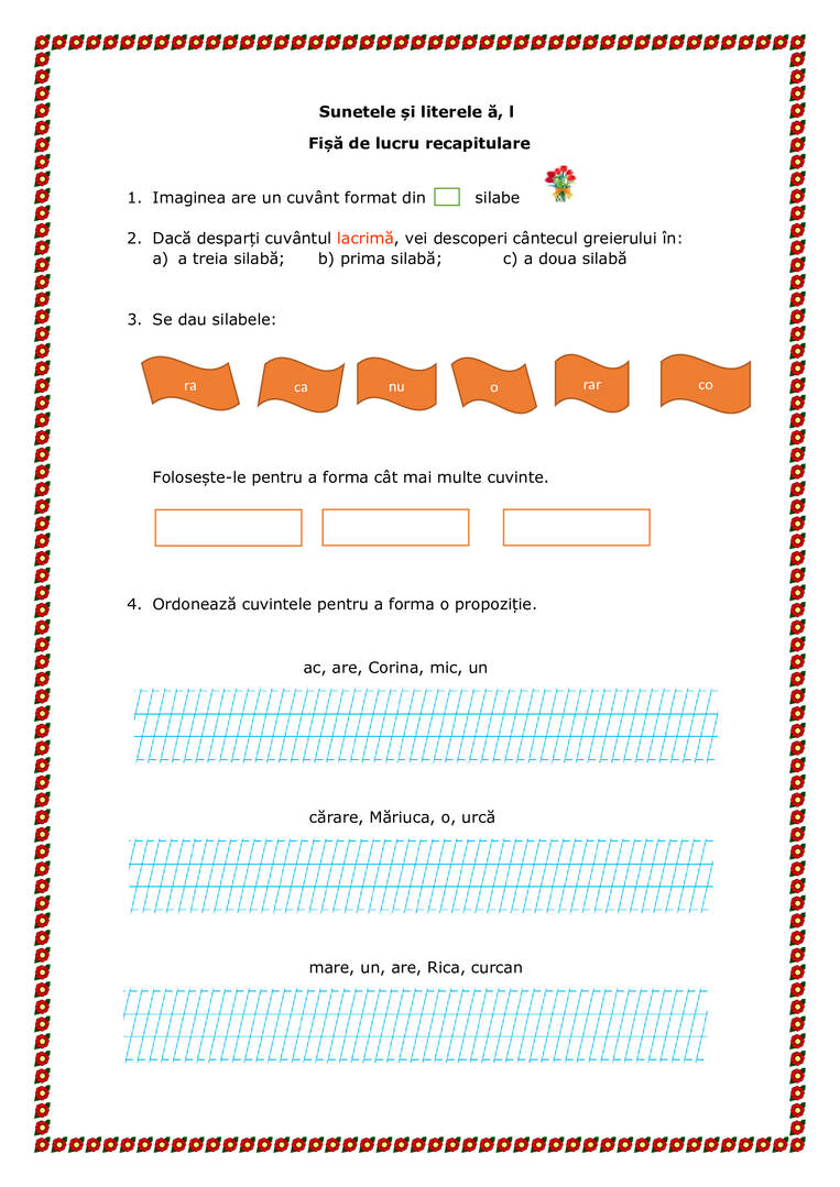 Sunetele și literele ă, l Fișă de lucru recapitulare și consolidare