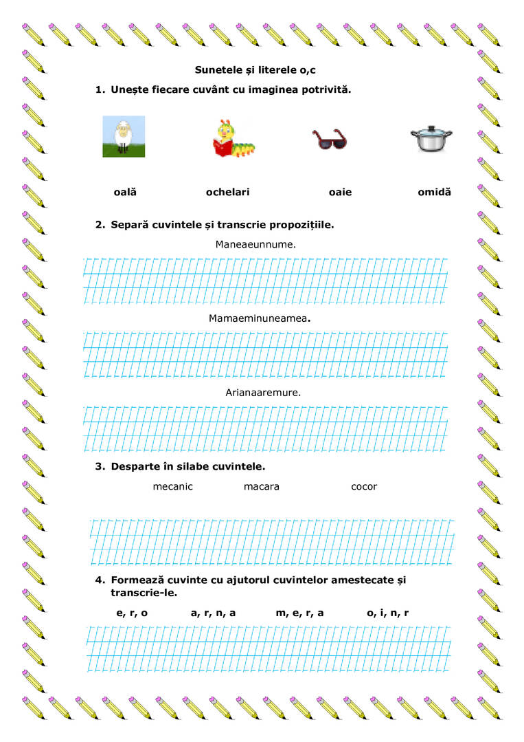 Sunetele și literele o,c. Fișă de lucru clasa 1 consolidare