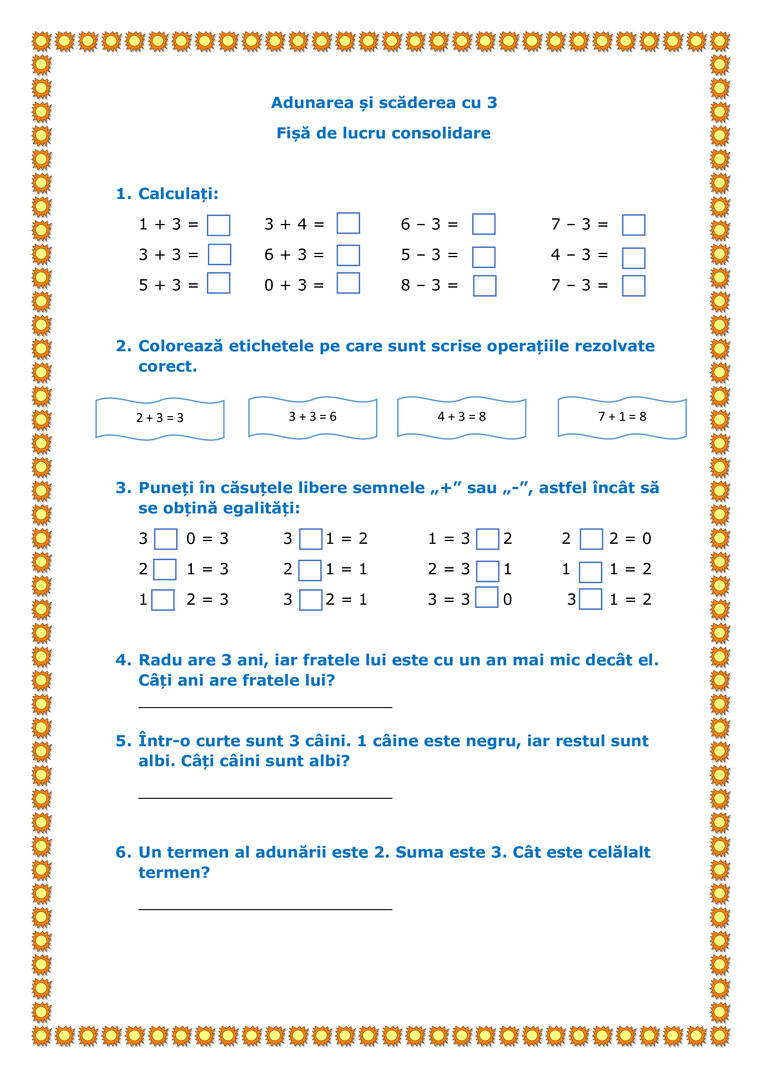 Adunarea și scăderea cu 3. Fișă de lucru consolidare MEM clasa 1