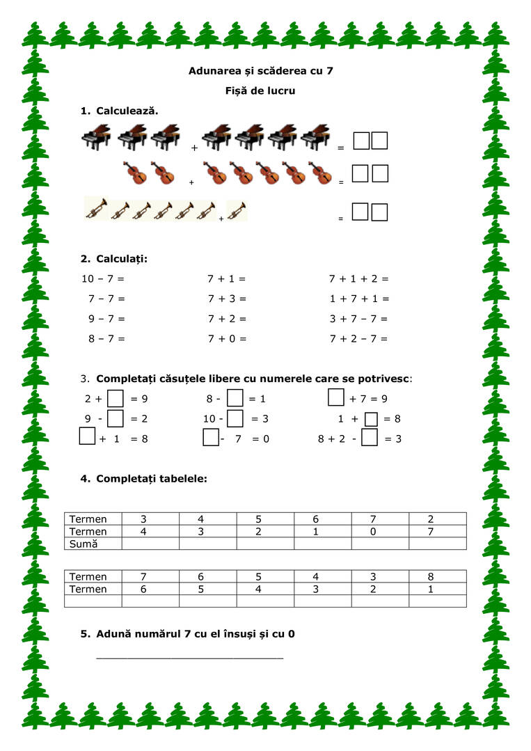 Adunarea și scăderea cu 7. Fișă de lucru MEM clasa 1