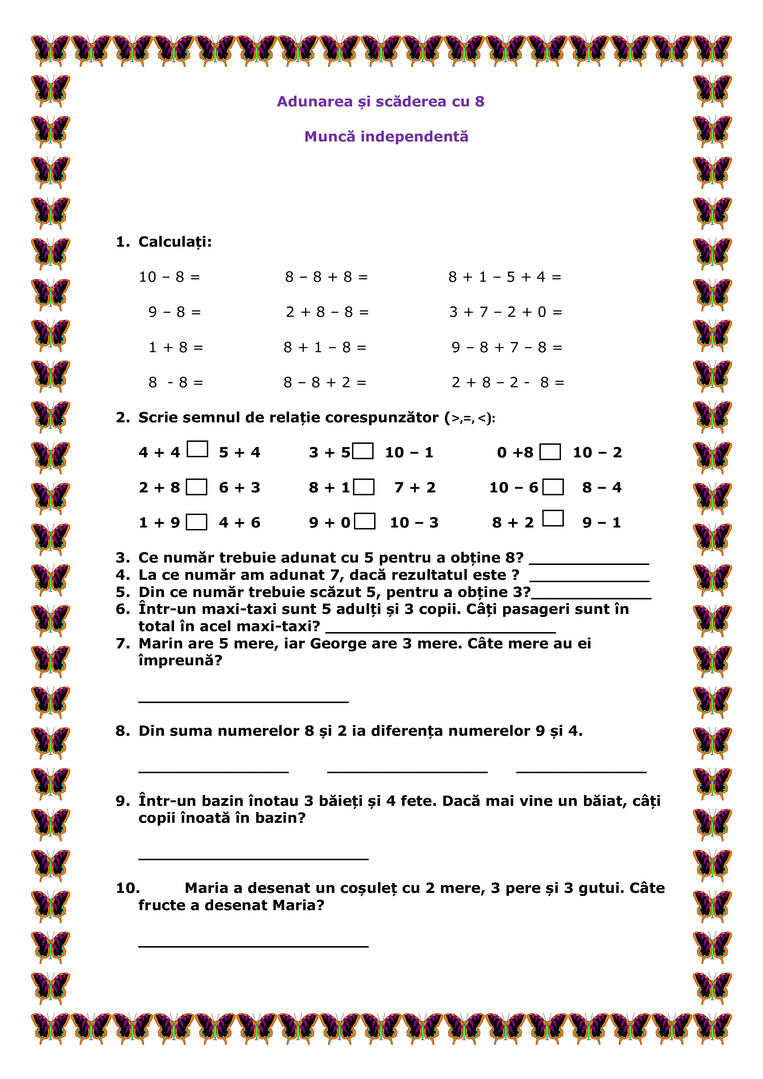 Găsești fișa de lucru adunarea și scăderea cu 8, în format word și în format jpg.