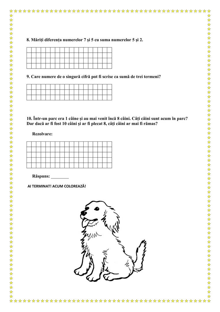 10. Într-un parc era 1 câine și au mai venit încă 8 câini. Câți câini sunt acum în parc? Dar dacă ar fi fost 10 câini și ar fi plecat 8, câți câini ar mai fi rămas?