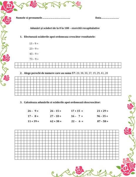 🤠 Fișa de lucru vă propune exerciții de aprofundare și dezvoltare a cunoștiințelor despre adunarea și scăderea numerelor naturale de la 0 la 100