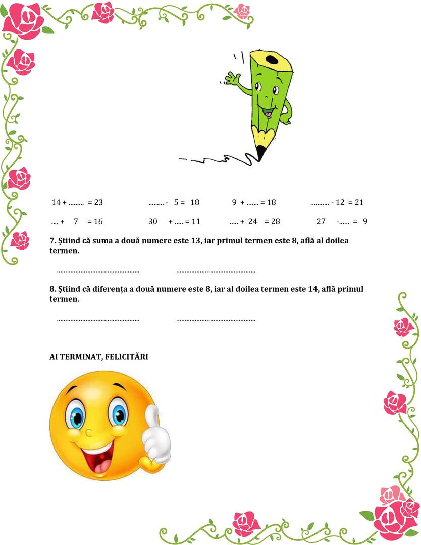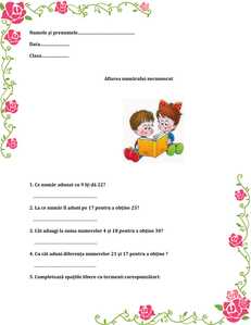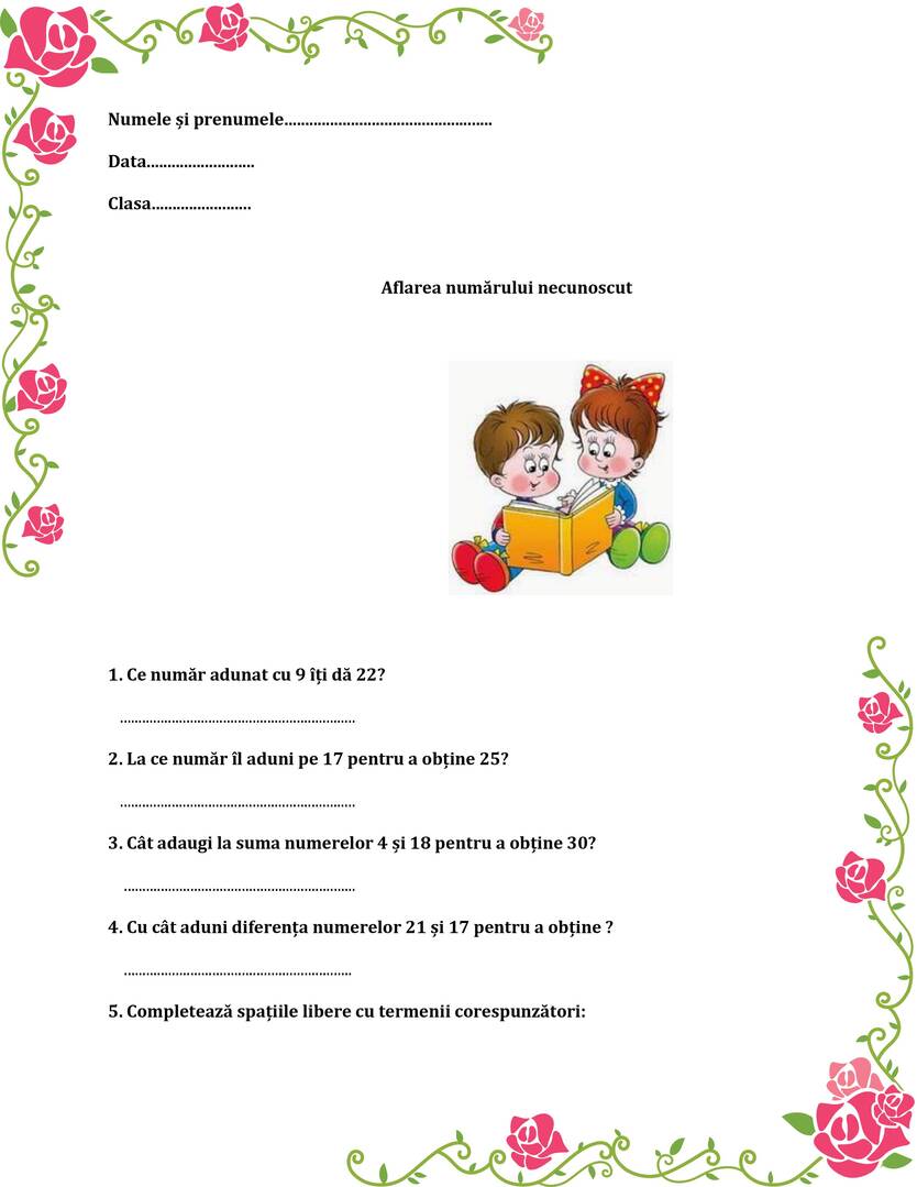 Aflarea numărului necunoscut - Fișă de lucru clasa I matematică și explorarea mediului