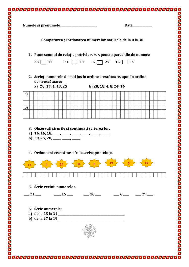 Compararea și ordonarea numerelor naturale de la 0 la 30. Fișă de lucru recapitulare