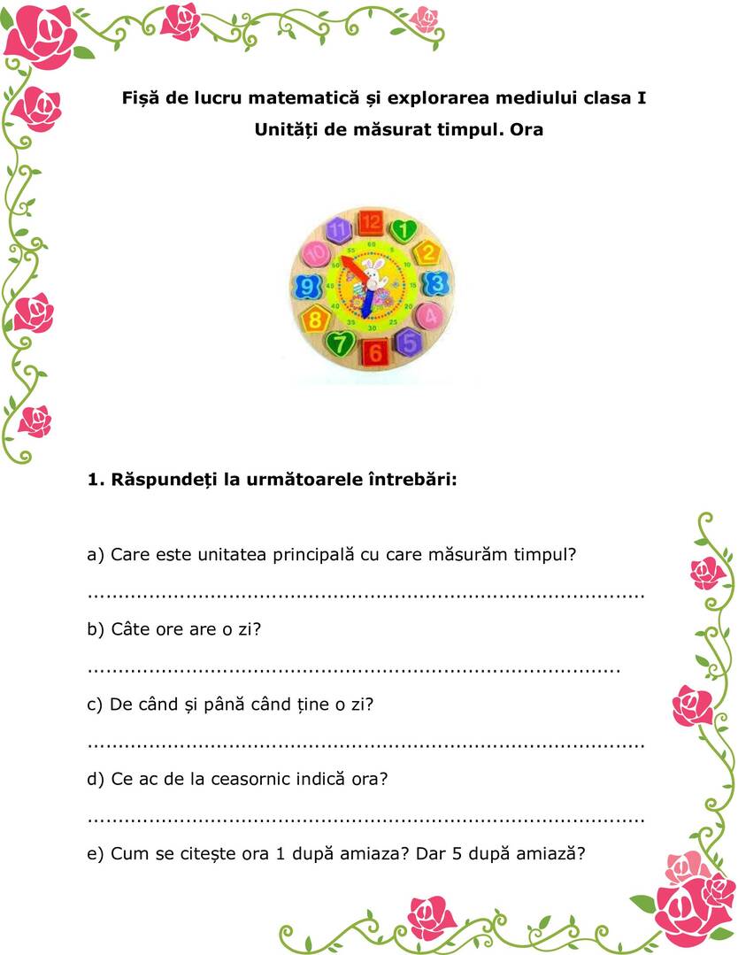 Matematică - Măsurarea timpului: ora, ziua, săptămâna - Fișe de lucru clasa I
