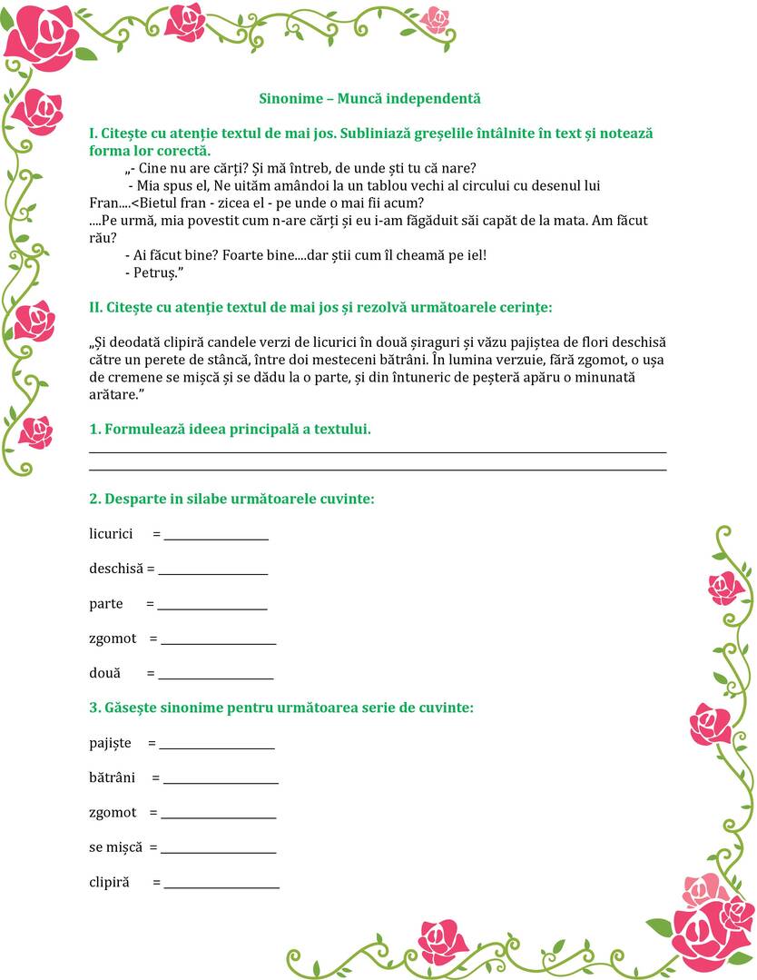 Cuvinte cu sens asemănător(sinonime) - Muncă independentă clasa a III-a