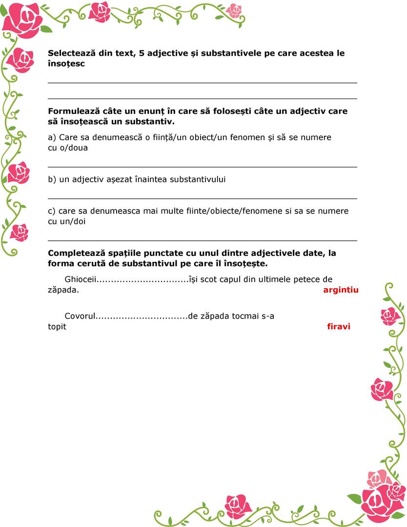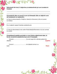 Formulează câte un enunț în care să folosești câte un adjectiv care să însoțească un substantiv.