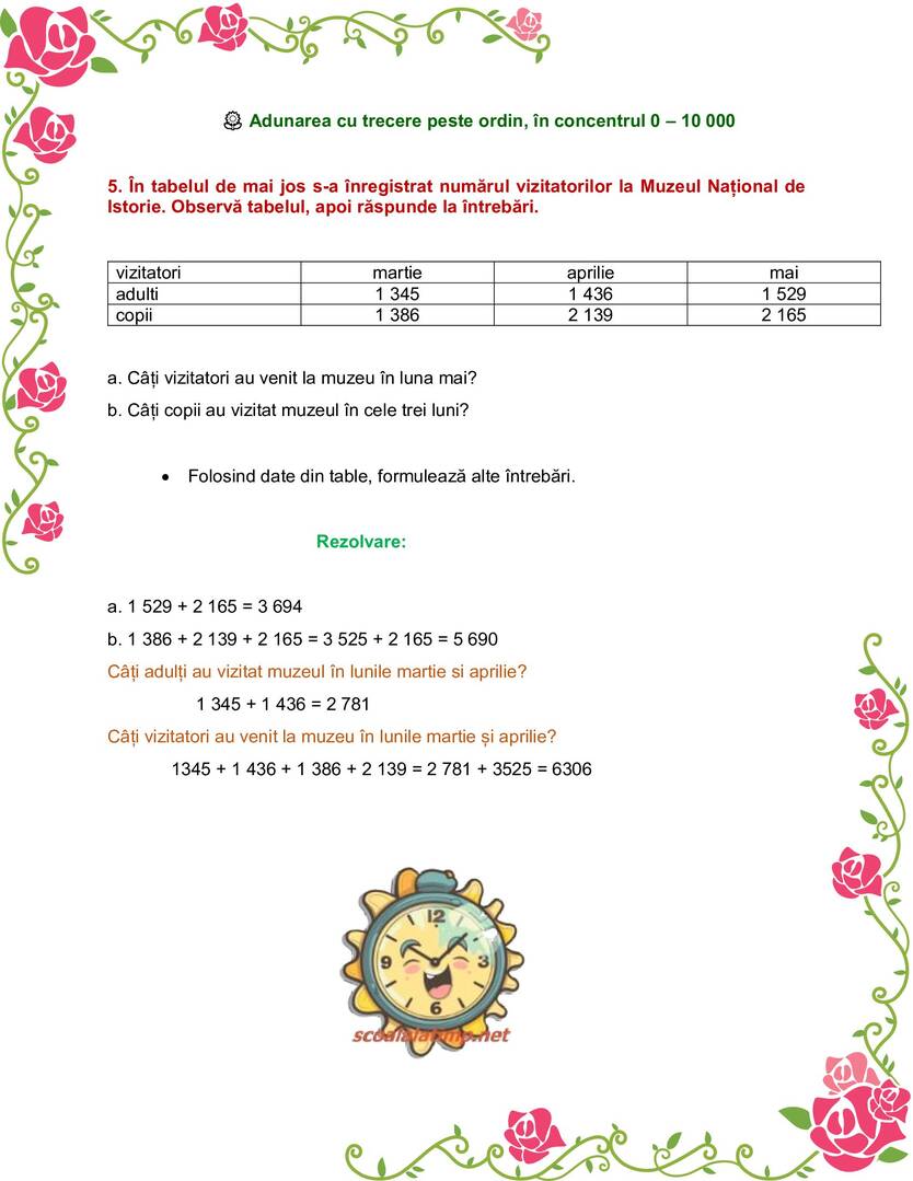 Adunarea cu trecere peste ordin, în concentrul 0 – 10 000. Exerciții rezolvate clasa a III-a
